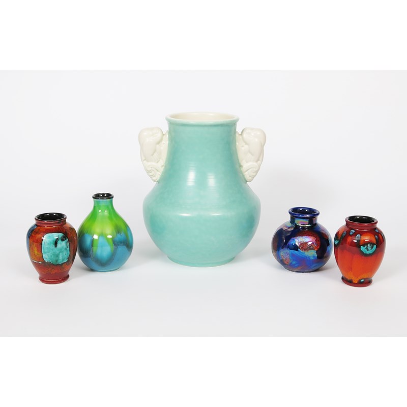 An Art Deco Poole Pottery vase designed by John Adams, shape no.503, shouldered form, applied with two dove handles, spray-glazed matt ice green and mushroom, and four modern Poole Pottery vases, impressed and printed marks, 25cm. high, (5)