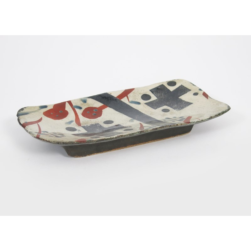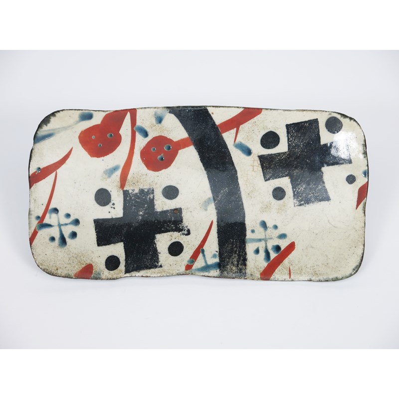a stoneware footed dish, rectangular form painted with cross motif in shades of black and dark blue, highlighted with coral red brush strokes on a pale grey ground, painted Maltby signature, 25cm. wide.