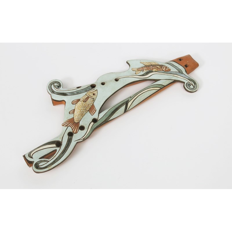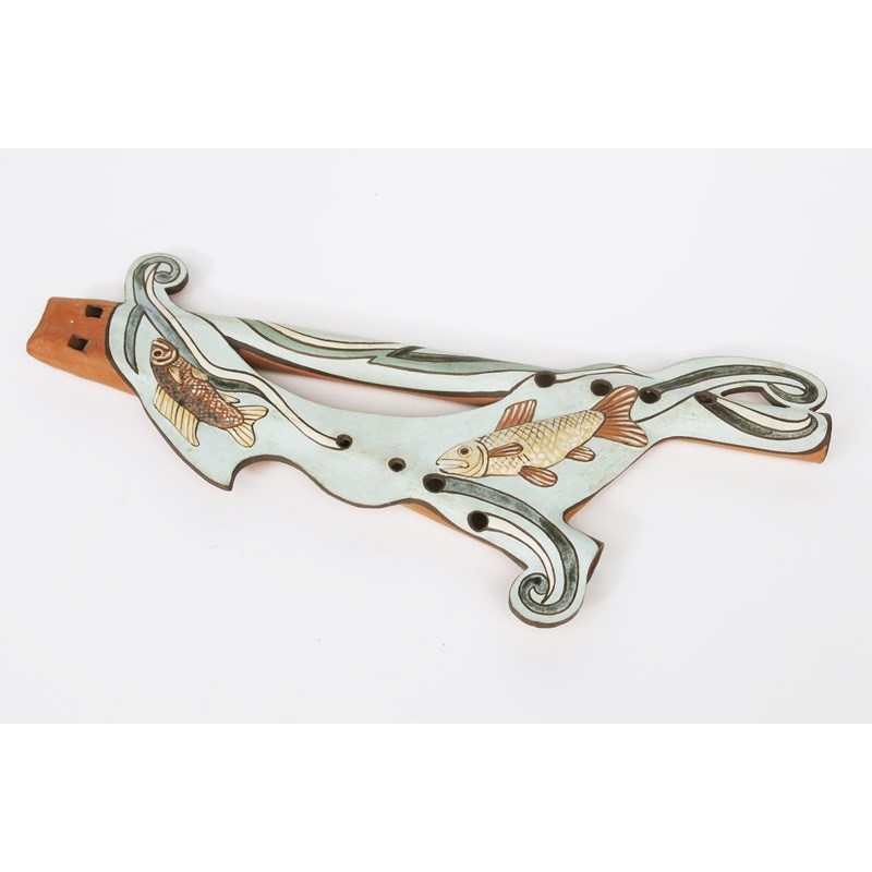 a terracotta double flute, dated 1984, cast in low relief with two fish and waterweed, incised signature and date, 36.5cm. long