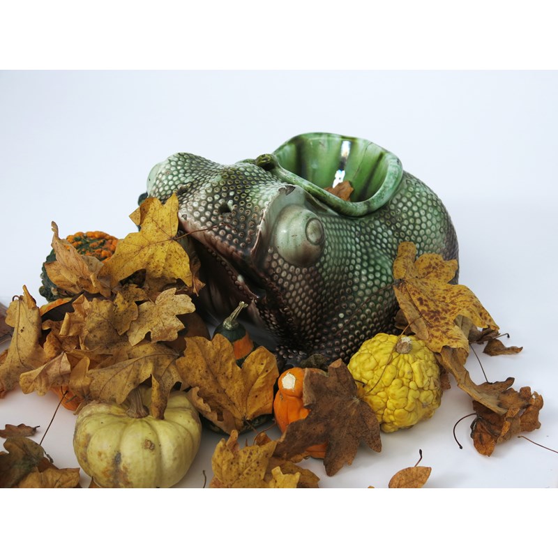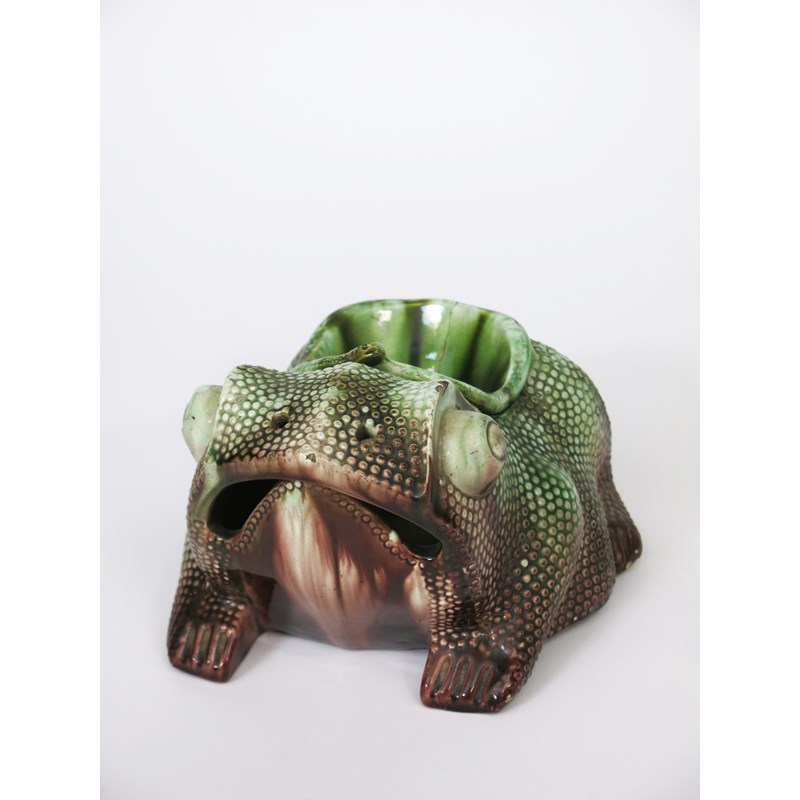 An Ault Pottery toad probably designed by Dr Christopher Dresser, model no. 854, modelled with scaly skin, the vase and liner glazed green and aubergine, impressed number 854, glaze chips and repair to liner, 21cm. wide (2)