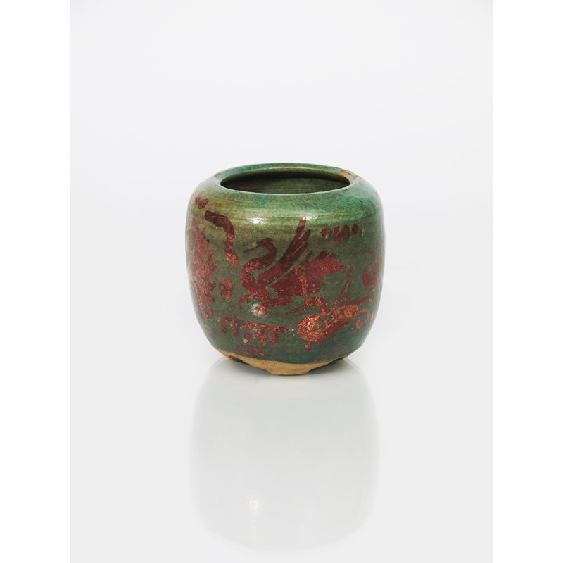 A lustre glazed pottery vase in the manner of Bushey Pottery, shouldered cylindrical form with inverted rim, on three moulded feet, decorated with mythical birds, in red lustre on a green ground, unmarked, 13cm. high