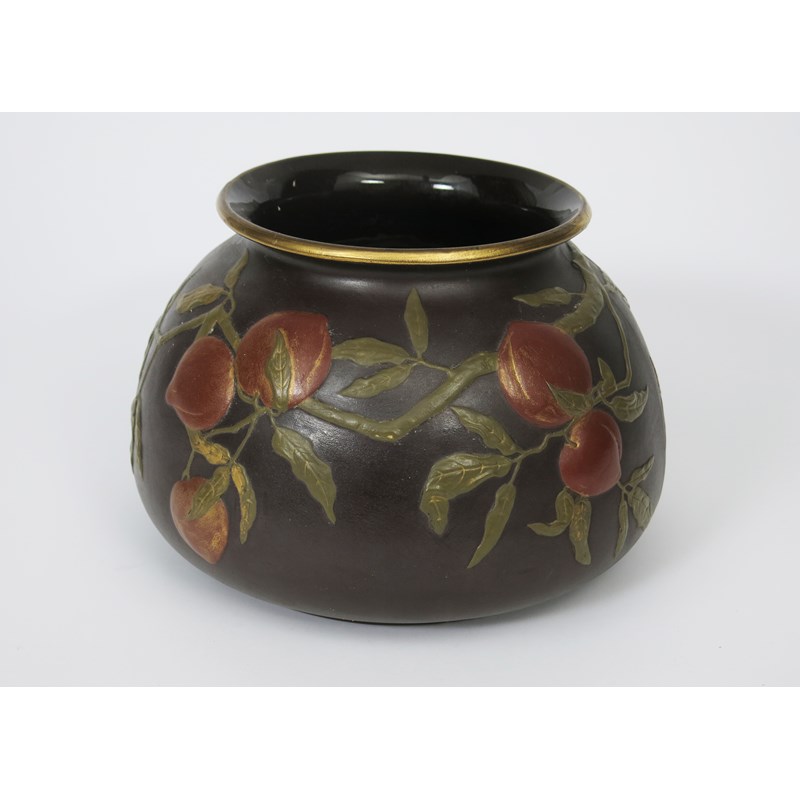 An Aesthetic Movement Minton's pottery vase, compressed form with everted rim, cast in low relief with a band of fruit and foliage in red, olive green and gilt on a brown ground impressed marks, 18cm. high