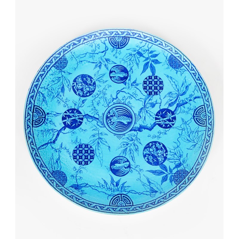 An Aesthetic Movement Minton's Pottery wall charger, printed in dark blue with Oriental roundel depicting birds butterflies and bamboo stems, geometric mon, on a foliate background, on turquoise ground, impressed marks, 40cm. diam.