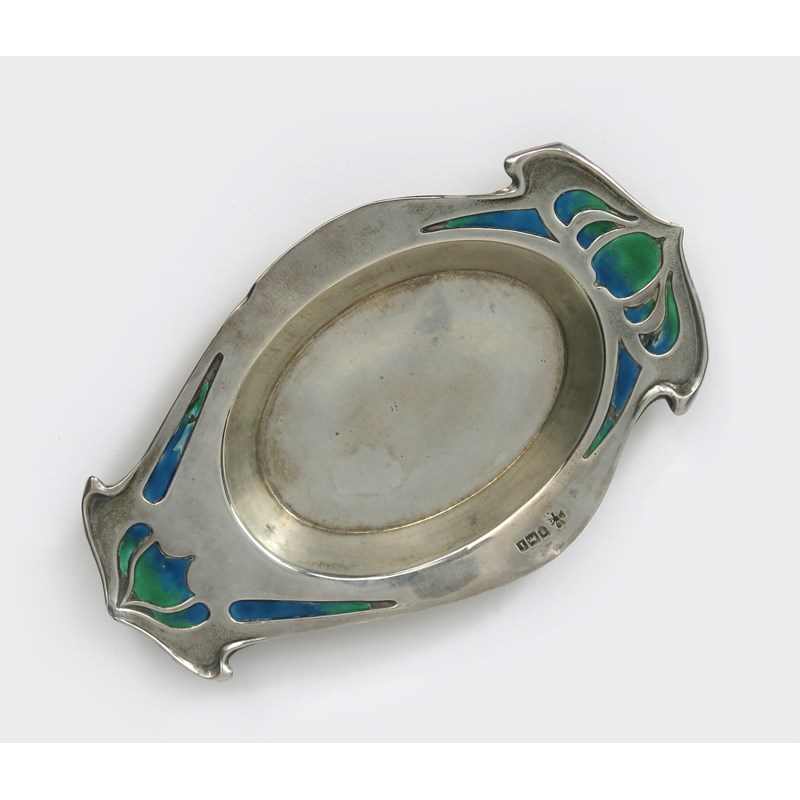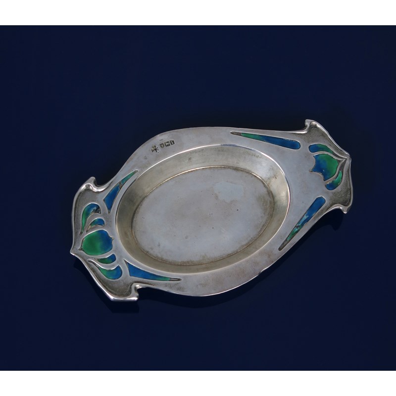A George Connell silver and enamel dish probably retailed by Liberty & Co, elliptical section, stamped with two foliate handles, enamelled in blue and green stamped marks, London 1904, 16cm. wide