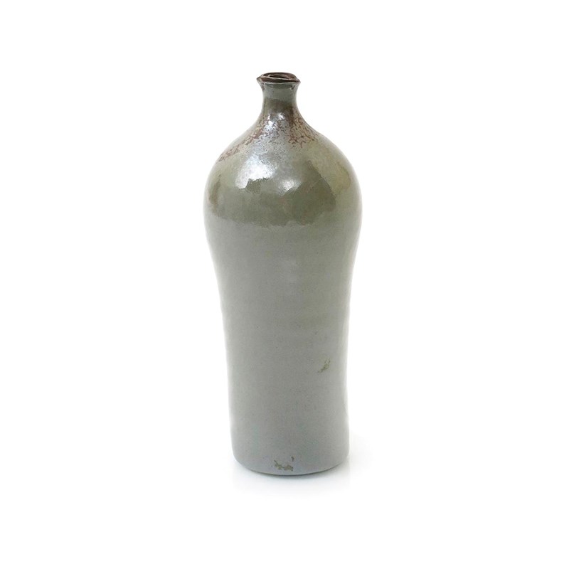 a porcelain vase, swollen, shouldered form with slender neck and modelled rim, covered to the shoulder with a lustrous glaze over grey, impressed seal mark to side, 17cm. high