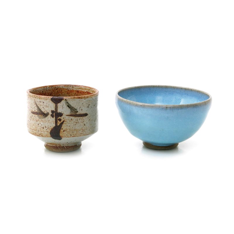 a stoneware unomi, footed form covered with a speckled opaque glaze, painted with iron red grasses motif, and an Avoncroft Pottery footed bowl by Geoffrey Whiting covered in a thick blue Chun glaze, impressed seal marks, 7.5cm. high (2)