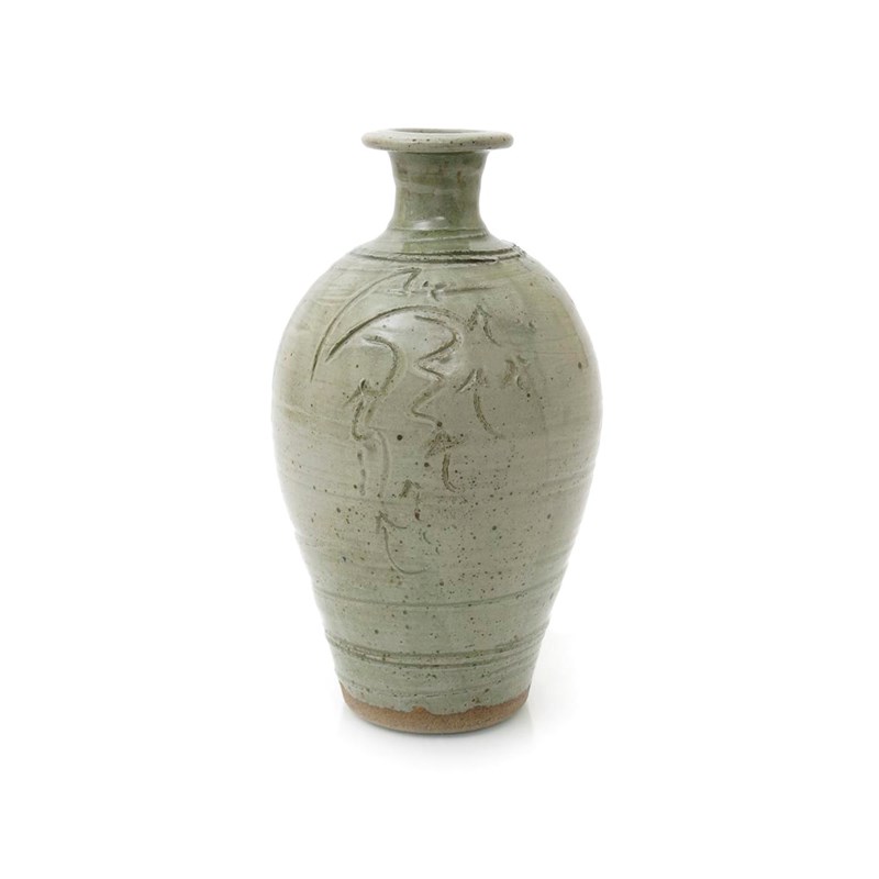 a stoneware vase, shouldered form with flaring neck, incised with simple glass motif, glazed to the foot in celadon impressed seal mark, 33cm. high