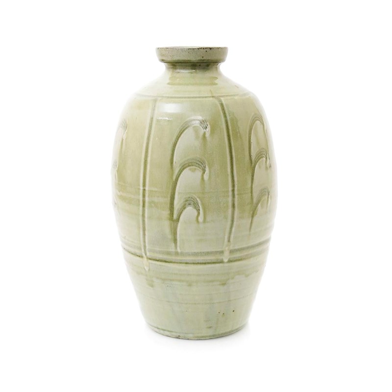 a stoneware vase, shouldered form with flaring cup rim, incised with panels of simple grass motif, covered to the foot in an ash glaze, impressed seal mark to side of base 41cm. high