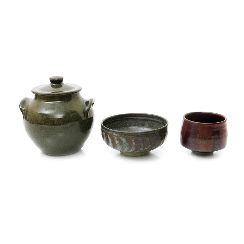 a stoneware bowl, glazed to the foot with a volcanic blue and mottled olive glaze with tenmoku stripes, a stoneware jar and cover by Geoffrey Whiting and a Unomi tea bowl by Geoffrey Whiting, impressed seal mark, 16cm. diam. (4)