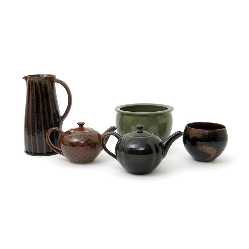 a tall stoneware jug, slightly faceted form covered in a rich tenmoku glaze with iron-red vertical stripes, two Andrew Crouch teapots with covers, a celadon green jardiniere and a smaller vase covered in a tenmoku glaze by the same artist impressed seal marks, 26.5cm. high, (5)