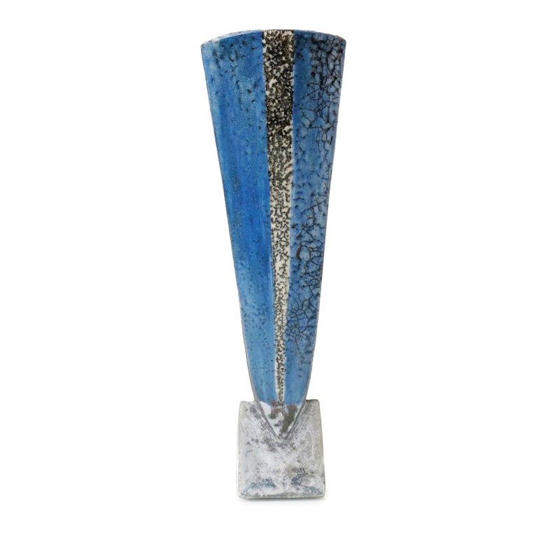 a slab built raku vase on base, the flaring body with crackled and running blue raku glaze and central white band, impressed seal mark to base, paper Galerie Besson label, 32cm. high