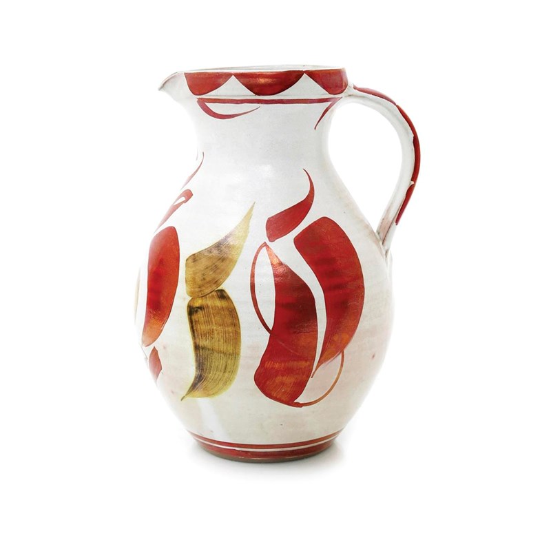 an Aldermaston Pottery jug, dated 1987, probably thrown by Juliet Wilson, bellied form covered in a tin-glaze, painted with simple ruby and ochre brush-strokes, painted marks to base, painted date code for 1987, 25.5cm. high