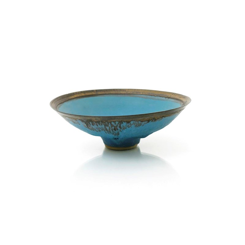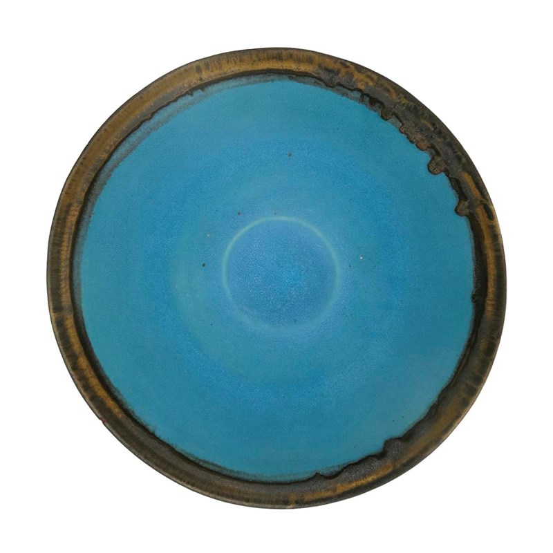 a porcelain footed bowl, low, flaring form, covered in a turquoise blue glaze to the foot with volcanic running patches, with bronze rim, impressed seal mark, small nick to bronze rim, 22cm. diam.