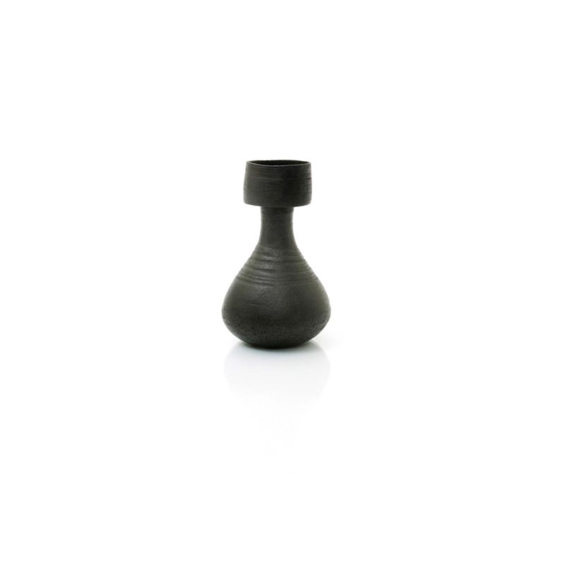 a stoneware vase, tapering pear shape with cylindrical neck, covered in a black glaze, impressed seal mark to base, 20cm. high