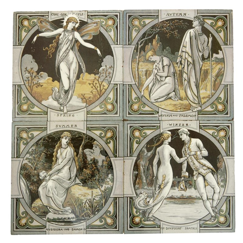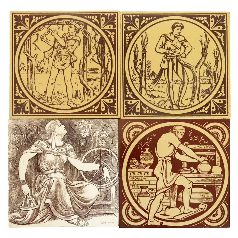 A set of Twelve Minton's Tennyson's Idylls of the Kings tiles designed by John Moyr Smith, printed in brown and blue on a cream ground, mounted on board, a set of four Minton's Season's tiles designed by Moyr Smith and an Astronomy tile and three other tiles facsimile signature, 61 x 46cm. (main panel), (6)