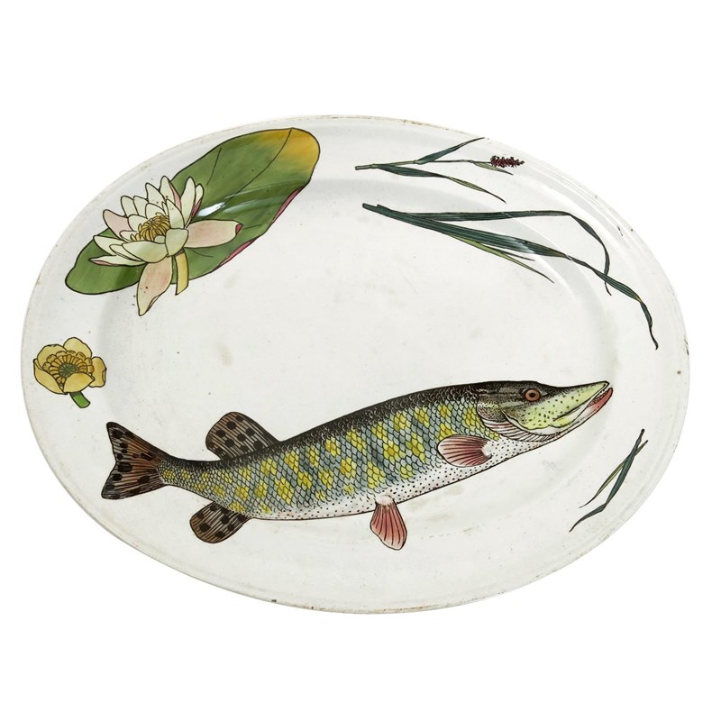 A large Minton & Co earthenware serving platter designed by William S Coleman, printed and painted with a large pike fish swimming amidst waterweed and water-lilies, in colours on a white ground, impressed and printed marks, 54cm. wide.