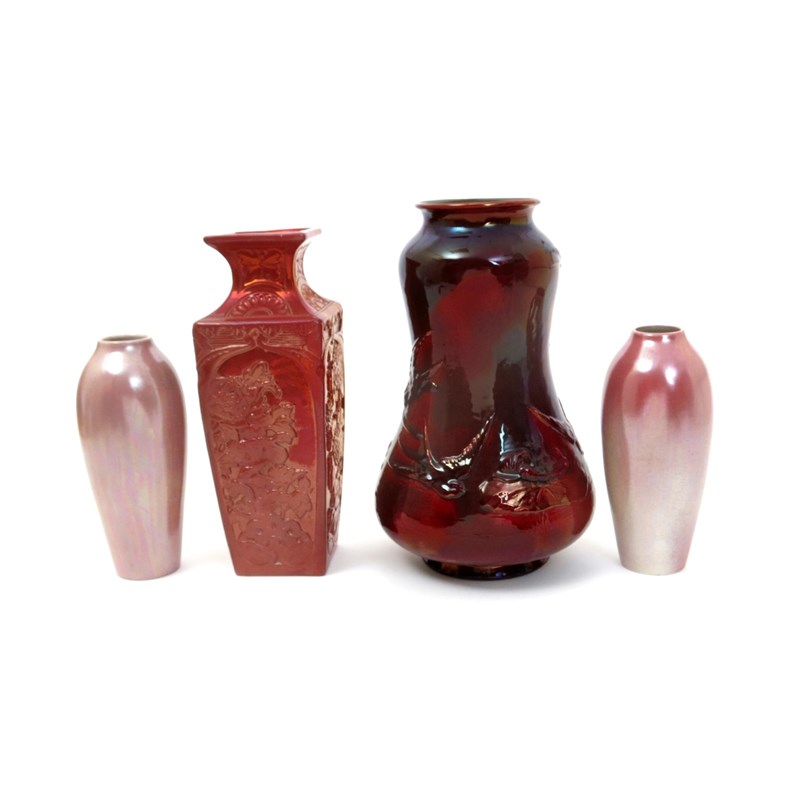 An unusual Aesthetic Movement Bretby Pottery lustre vase, model no.2098, waisted cylindrical form. moulded in relief with swallows swooping over water-lily pads, glazed red lustre, another Bretby Pottery Aesthetic Movement lustre vase and a pair of streaked pink lustre vases, impressed marks, 35cm. high, (4)