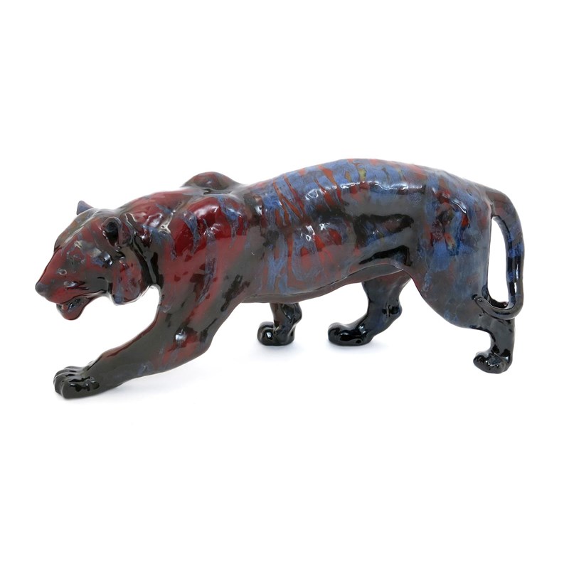 Tiger Stalking HN.1082 Royal Doulton Flambe model of a tiger designed by Charles Noke, modelled walking, glazed flambe red with lavender blue stripes, 35cm. wide