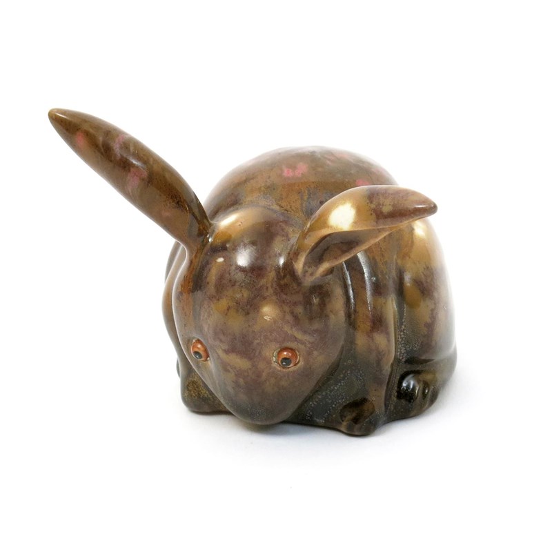 A Bernard Moore porcelain model of a rabbit, rotund with slender ears, covered in a mottled mushroom and pink flambe glaze with applied glass eyes, printed BM monogram 7.5cm. high