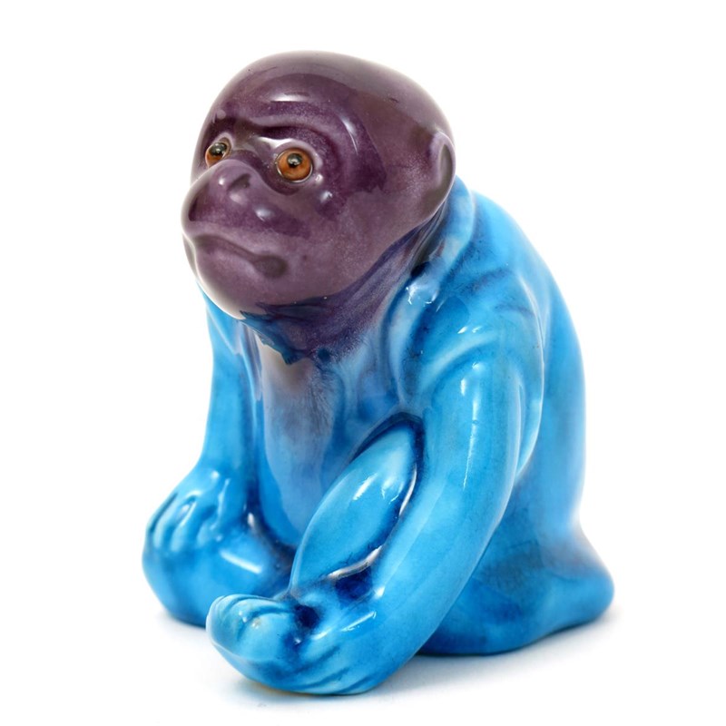 A Bernard Moore porcelain model of a seated monkey, glazed in a rare purple and turquoise colour way, with applied glass eyes printed BM monogram 9cm. high