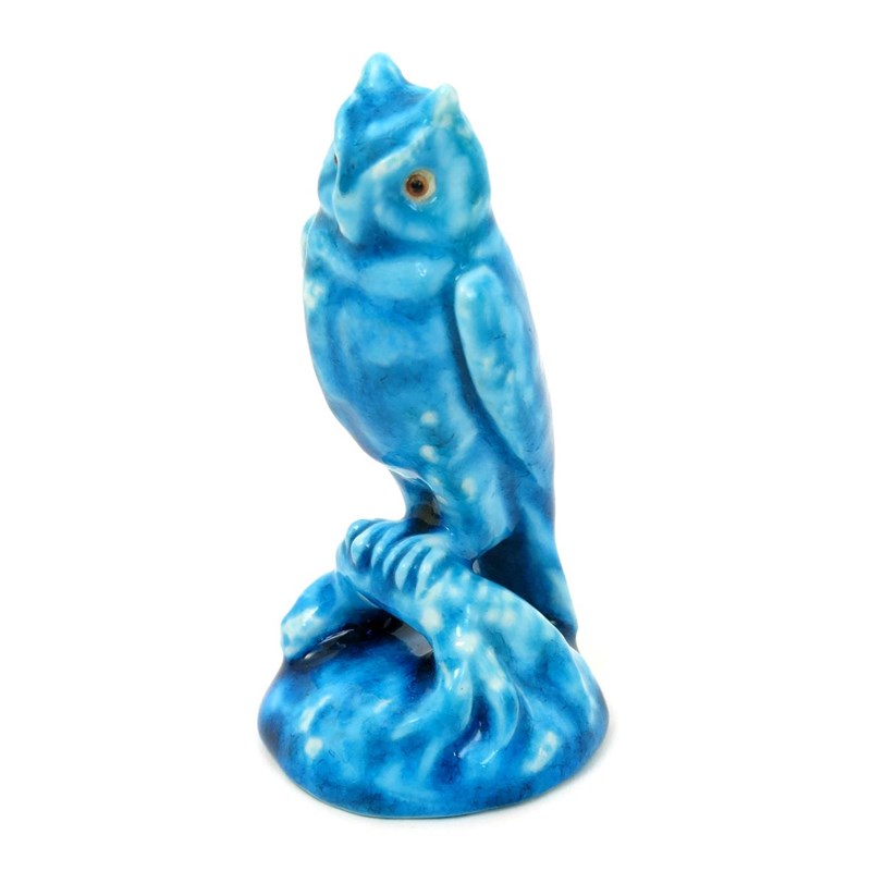 A Bernard Moore porcelain model of an owl, modelled perched on a tree bough, glazed turquoise blue, with applied glass eyes, BM monogram to base, 9.5cm. high