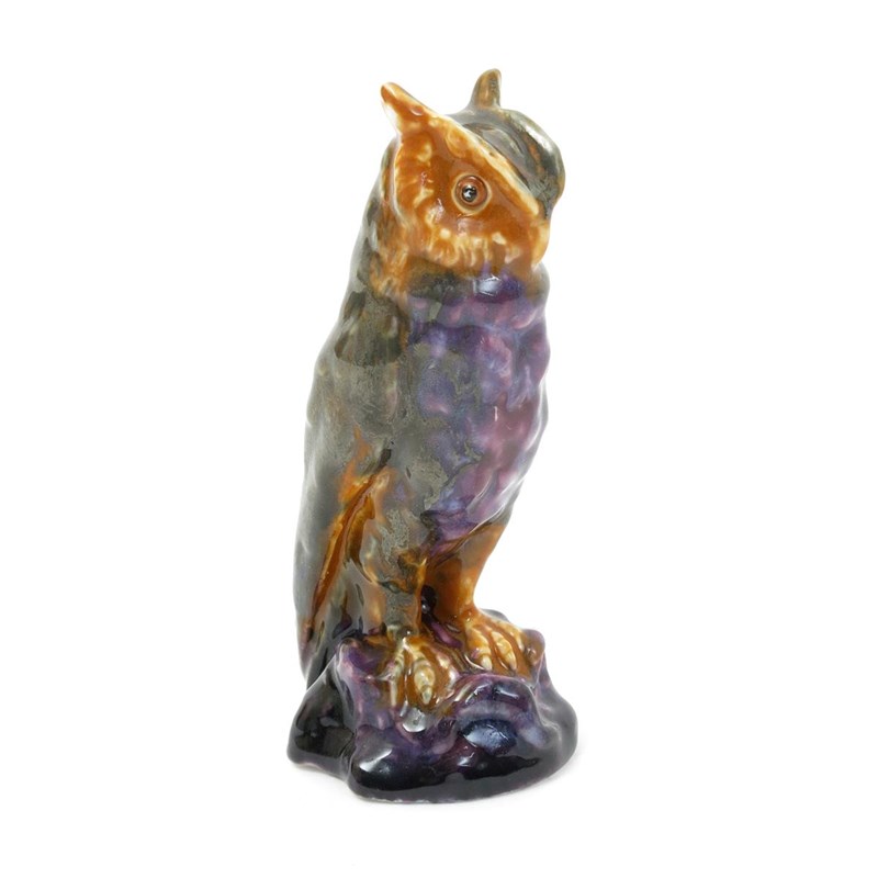 A Bernard Moore porcelain model of an owl, modelled perched on a rock, glazed in a rare purple, orange and ochre glaze, with applied glass eyes, printed BM monogram, 13cm. high