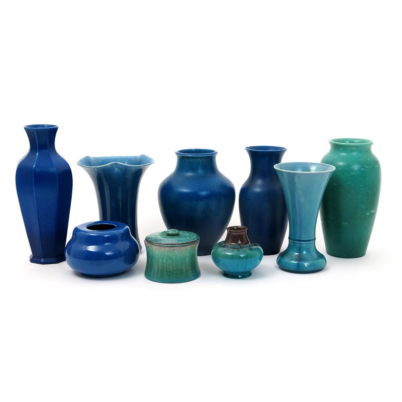 A Pilkington's Royal Lancastrian box and cover, circular section, covered in a streaked and veined turquoise and lavender experimental glaze, a small Pilkington's Royal Lancastrian vase with similar red and green glaze, a tall blue trumpet vase covered in a streaked blue glaze and fifteen other Pilkington's items, impressed marks, damages, 10cm. high (box and cover), (18)