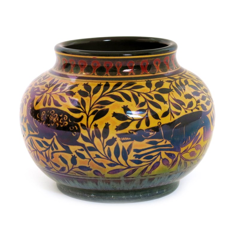 A Pilkington's Lancastrian vase by William S Mycock, dated 1912, ovoid with collar rim, painted with a hound chasing a deer, in bronze lustre on a vivid orange ground, the rim with stylised border in ruby lustre impressed factory mark, painted artist cipher and date code, 11.5cm. high