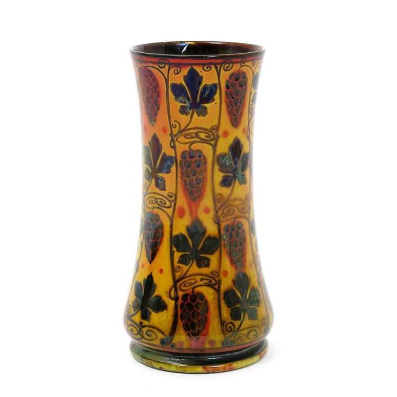 A Pilkington's Lancastrian vase by Richard Joyce, dated 1915, waisted cylindrical form, painted with columns of fruiting grape vine, in bronze and ruby lustre on a vivid orange ground, impressed marks, painted artist cipher and date code, 21cm. high