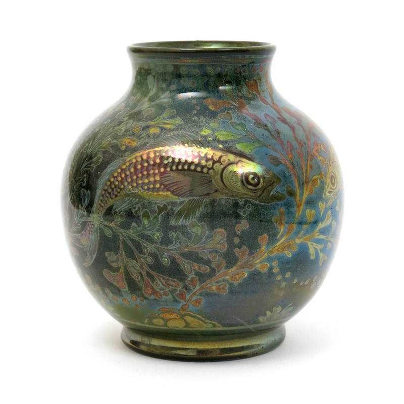 A Pilkington's Lancastrian vase by Richard Joyce, dated 1917, ovoid with everted rim, painted with fish swimming amongst waterweed in golden lustre on a blue ground, impressed marks, painted artist cipher and date code, small re-stuck chip to top rim, 11.5cm. high