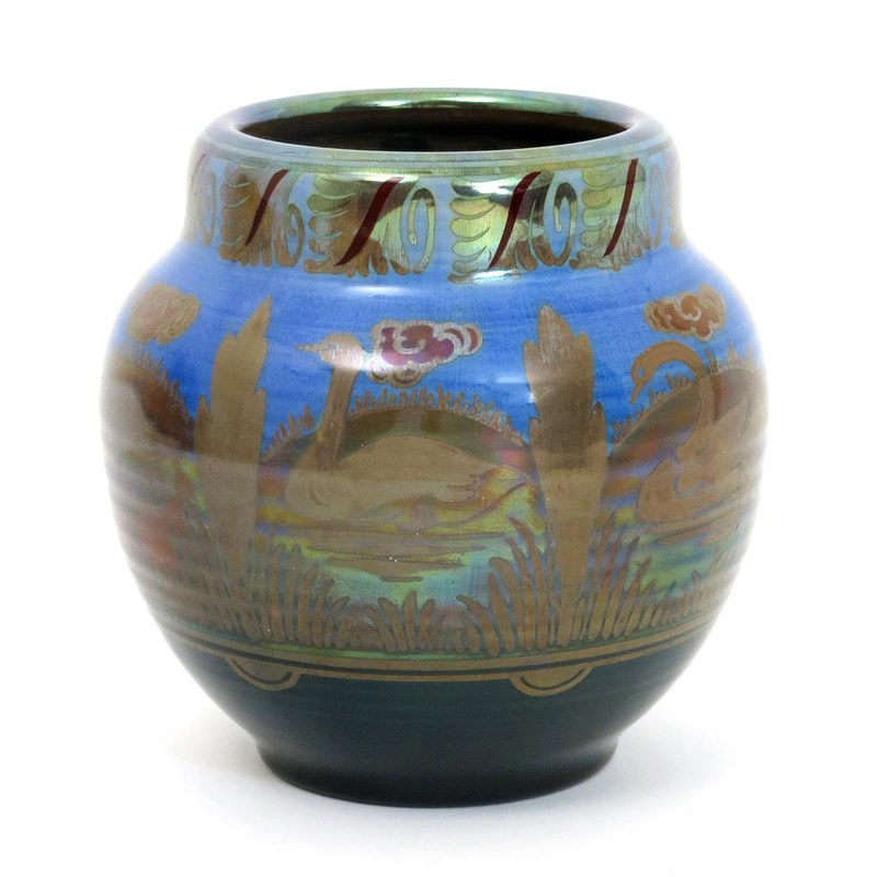 A Pilkington's Royal Lancastrian vase by William S Mycock, modelled by E.T. Radford, ovoid with collar rim, painted with a frieze of swans swimming on calm water, a sun rising in the distance, cypress trees in the foreground, in shades of ruby and golden lustre on a blue ground, impressed marks, painted artist cipher and incised E.T.R monogram, 17cm. high