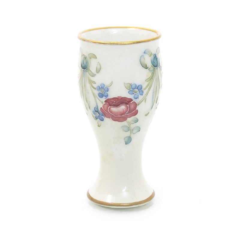 'Eighteenth Century' a James Macintyre & Co vase designed by William Moorcroft, slender baluster form, painted with floral swags in green, blue and red on a white ground, highlighted in gilt, printed factory mark and painted green signature, restored base, 7.5cm. high