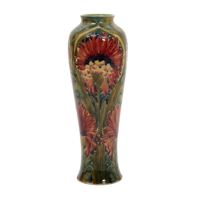 'Revived Cornflower' a tall James Macintyre vase designed by William Moorcroft, dated 1912, slender, baluster form, painted in shades of pink, purple, and ochre on a green ground with chrysanthemum flowers, printed factory mark, painted green signature and date, professional restoration to outside of top rim, 30cm. high