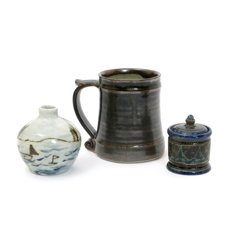 a stoneware mug, with applied scroll handle, covered in a tenmoku glaze, a Leach Pottery vase by Trevor Corser painted with a harbour scene and a small Fulham Pottery pot and cover in the manner of Edgar Kettle, impressed seal mark to base, 12cm. high, (4)