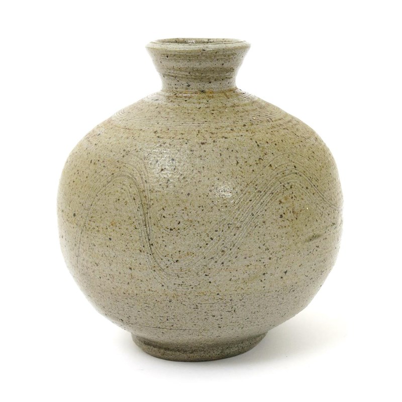 a St Ives stoneware vase, shouldered ovoid form with flaring neck, decorated with combed decoration, covered in an oatmeal glaze impressed seal marks, 17cm. high