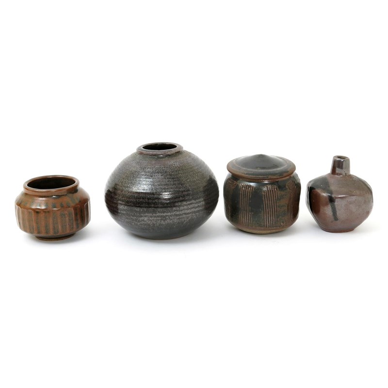 a St Ives pottery vase, square section with solifleur neck, covered in tenmoku glaze with dark splashed glaze to the shoulder, a David Leach stoneware vase and two other vases, impressed seal marks, 10.5cm. high (4)