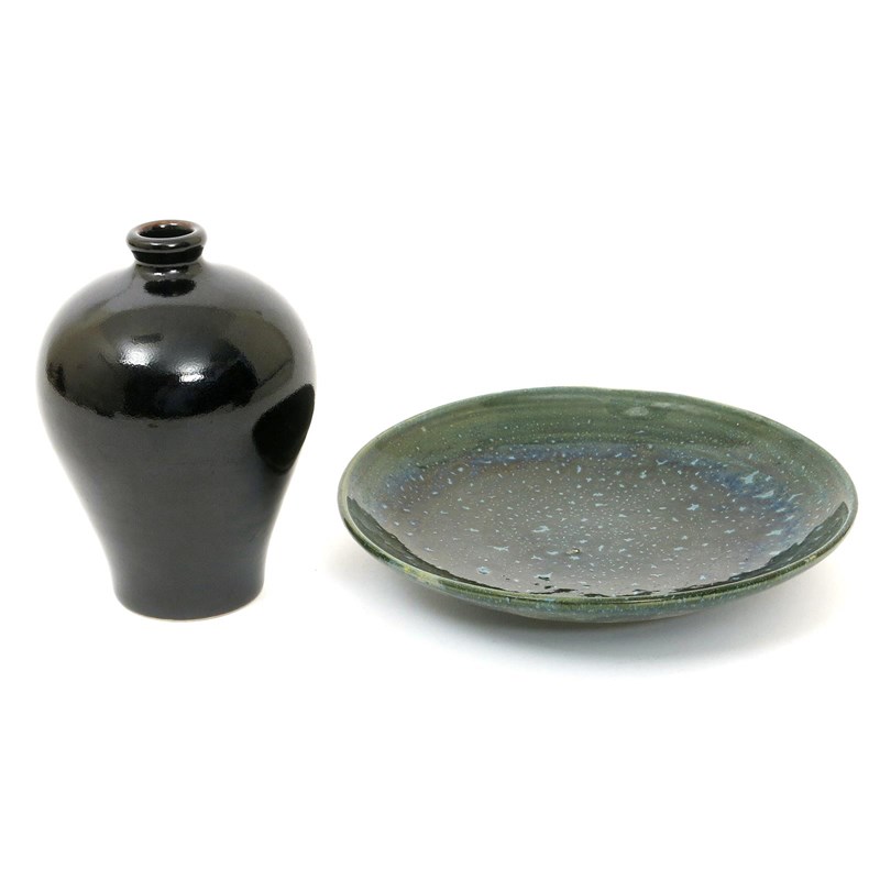 a porcelain bottle vase, swollen form, covered to the foot in a rich, dark tenmoku glaze, and a plate by Poh Chap Yeap covered in a deep green glaze with turquoise splashes, incised Yeap, fine hairline to plate, vase 14cm. high (2)