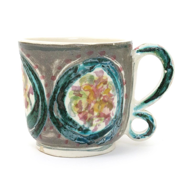 A Fulham Pottery mug possibly by Quentin Bell, cylindrical with applied handle, painted with foliate roundels in colours on a mushroom ground over cream, unsigned, small flat chip to top rim, 8.5cm. high
