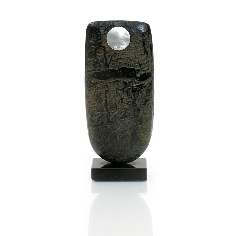Black Bow, a raku sculpture set with mother of pearl disc, on polished black slate base, signed Peter Hayes to base, 22cm. high