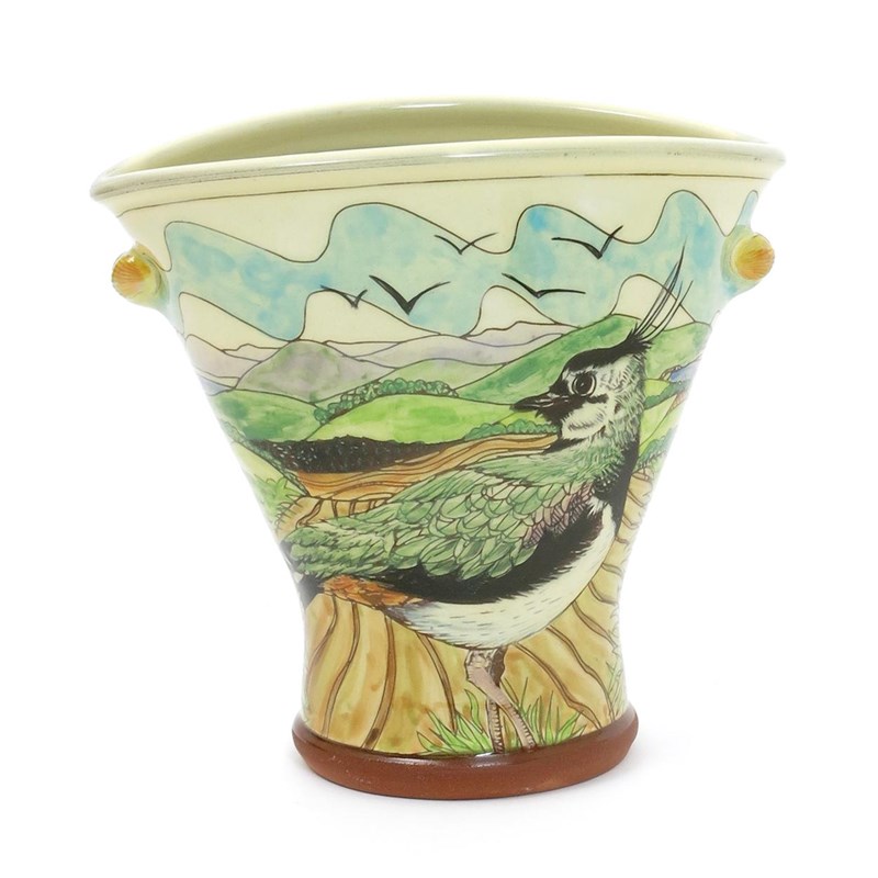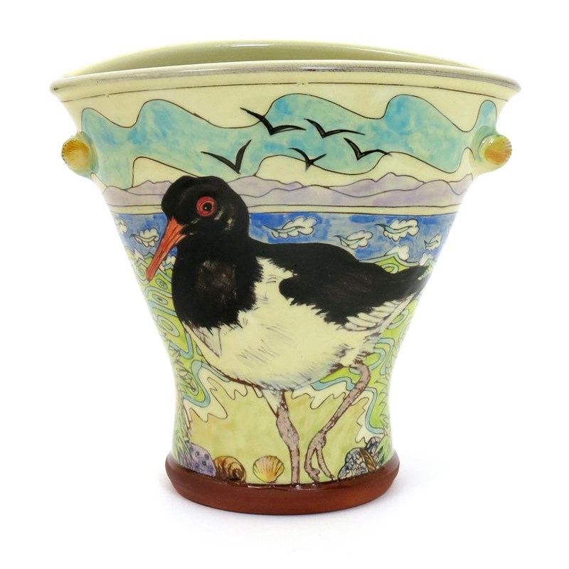Oystercatcher and Lapwing, a flattened, flaring vase, painted in colours and modelled with shell lugs, impressed seal mark to base, 20cm. high