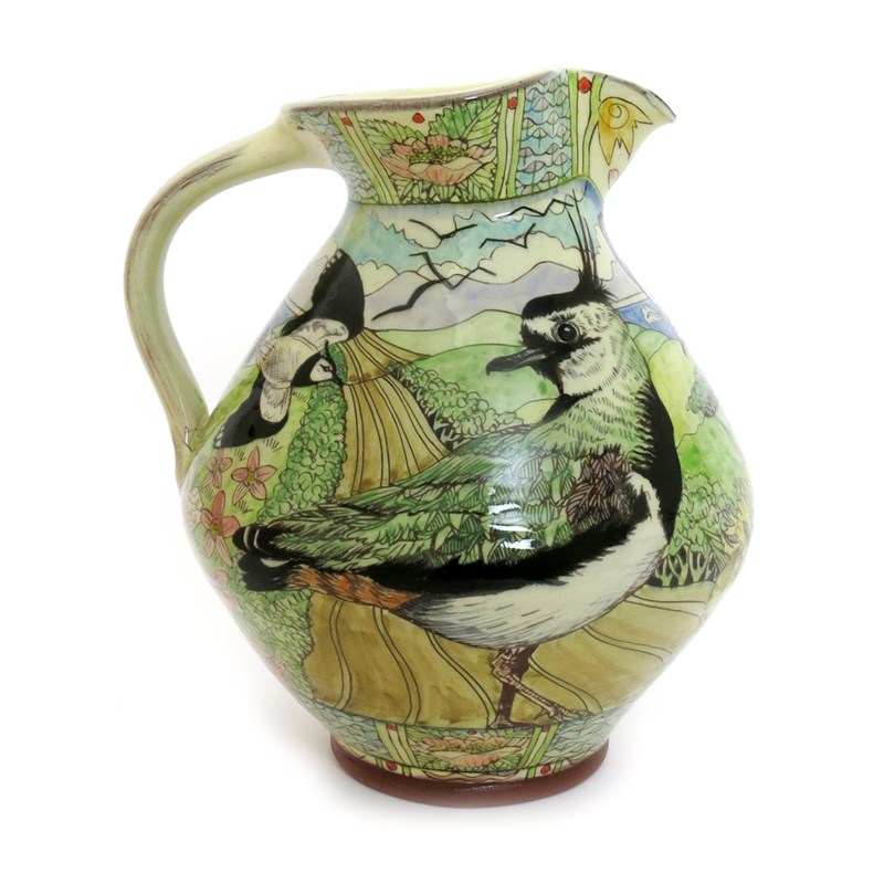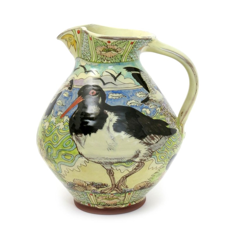 Oystercatcher and Lapwing, a bellied jug, painted in colours on a cream ground impressed seal mark to base, 24cm. high