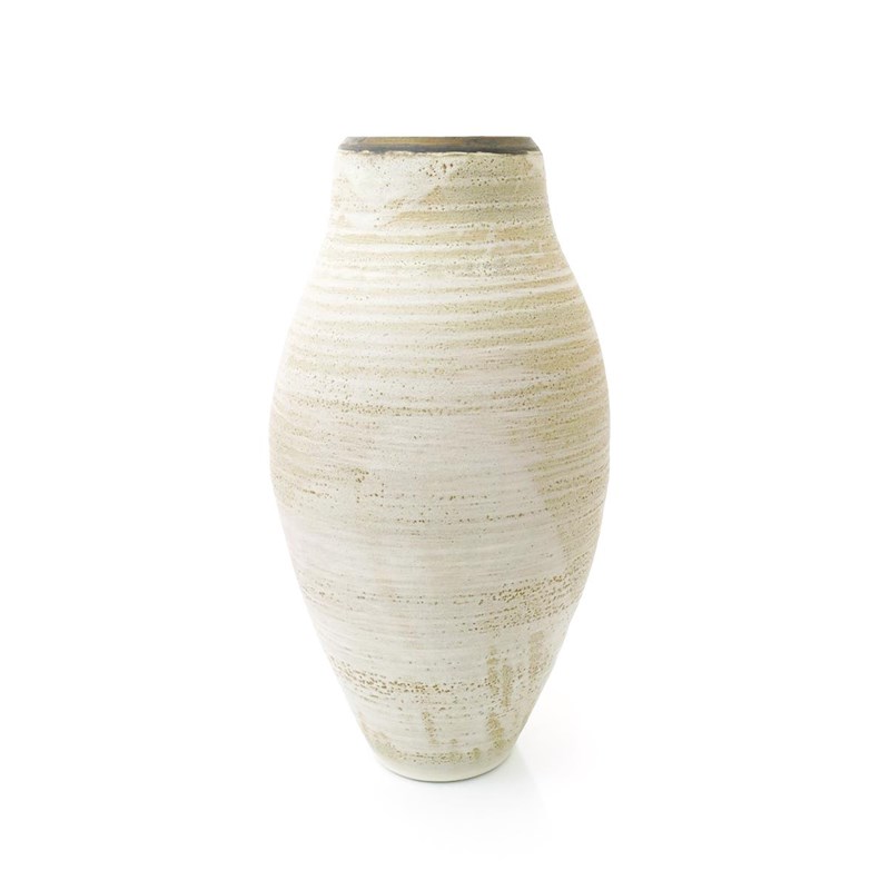 a tall swollen cylindrical vase with bronzed rim, covered to the rim in a pitted cream and mushroom glaze impressed seal mark, 54cm. high