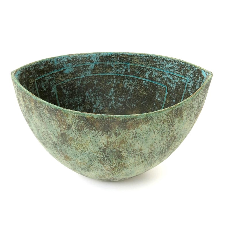 an unusual hand-built vase, tapering, elliptical section, with incised decoration to interior, glazed turquoise over brown, impressed seal mark to base, 28.5cm. wide.