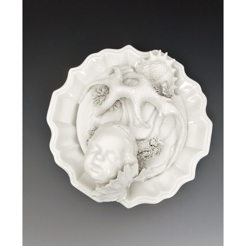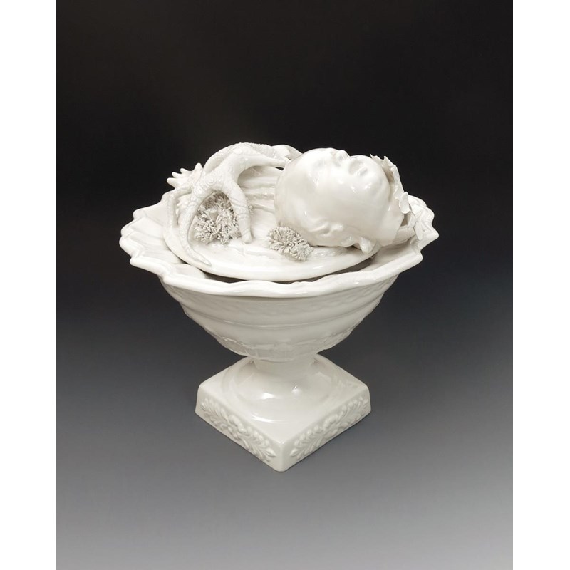 Baroque Rain a unique surrealist vase and cover with applied decoration of creatures, crab shell and a child's head to the cover, glazed white incised Renzi & Reale, 2005 to the rim, base printed made in Italy, 25.5cm. high (2)