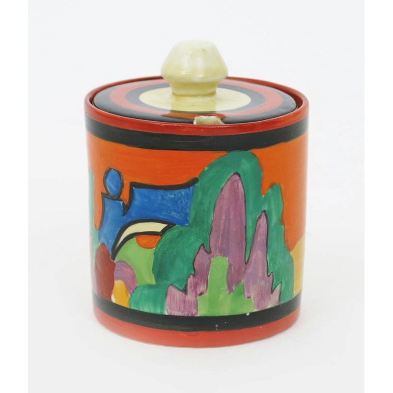 'Applique Avignon' a Clarice Cliff Bizarre Cylindrical preserve pot and cover