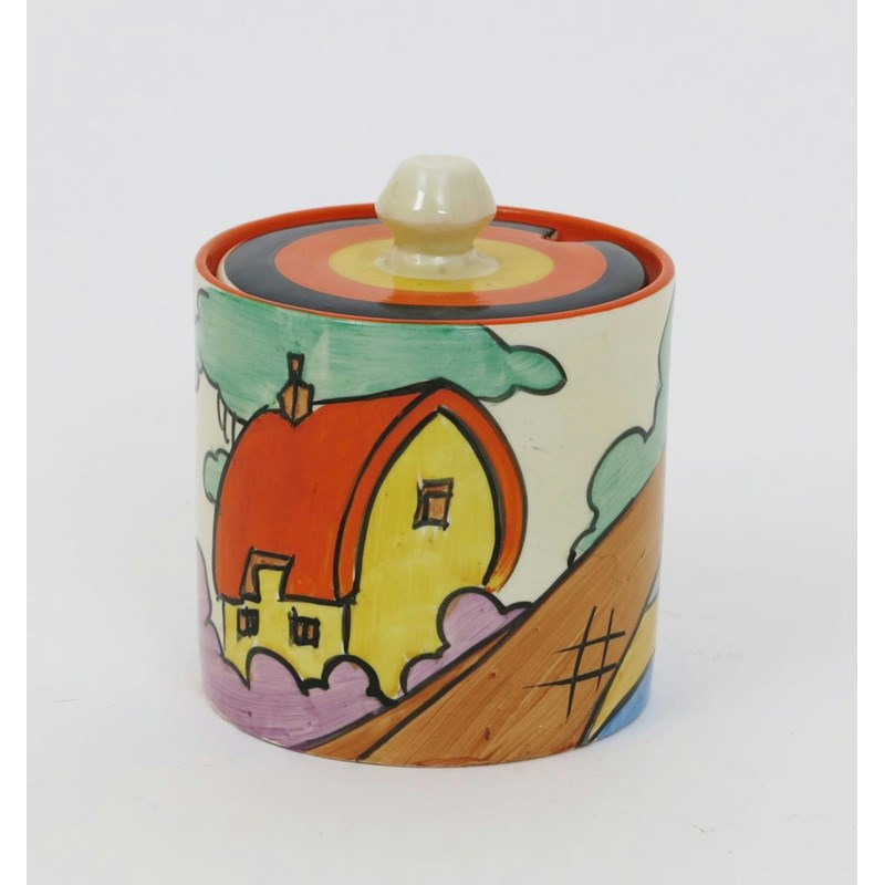 'Orange Roof Cottage' a Clarice Cliff Fantasque Bizarre Cylindrical preserve pot and cover