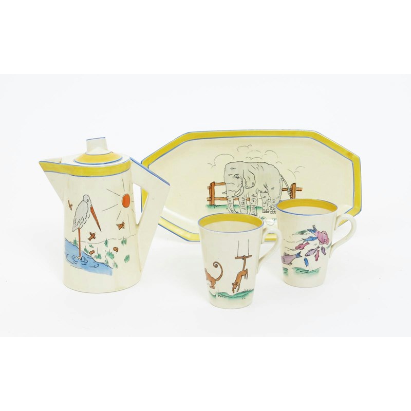 A rare Kiddies Ware hot-chocolate service designed by Joan Shorter, for Clarice Cliff, printed and painted with naive animals, in colours, comprising Conical coffee pot and cover, two beakers and a tray printed Joan Shorter Wilkinson mark, tray 29.5cm. wide. (4)