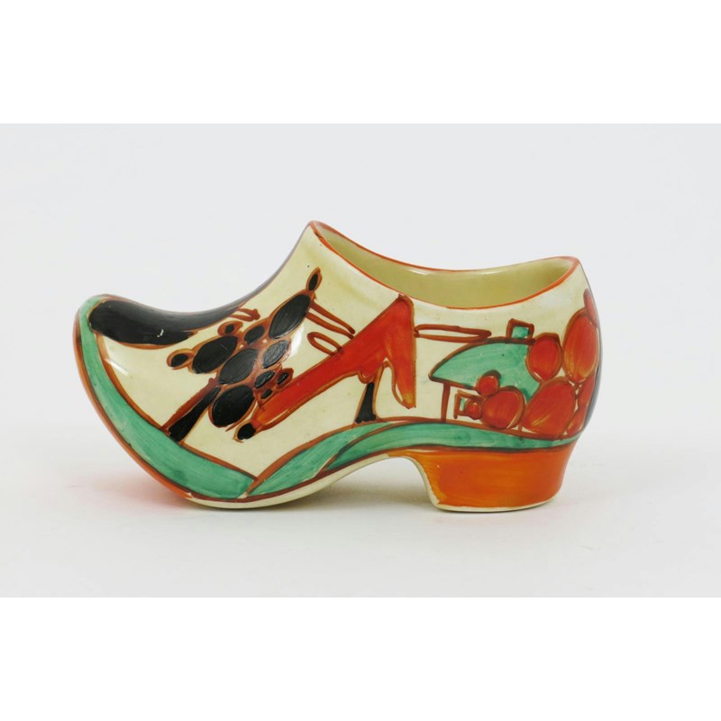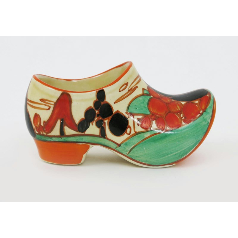 'Red Trees and House' a Clarice Cliff Fantasque Bizarre Clog, painted in colours printed factory marks, professionally restored 10.5cm. wide