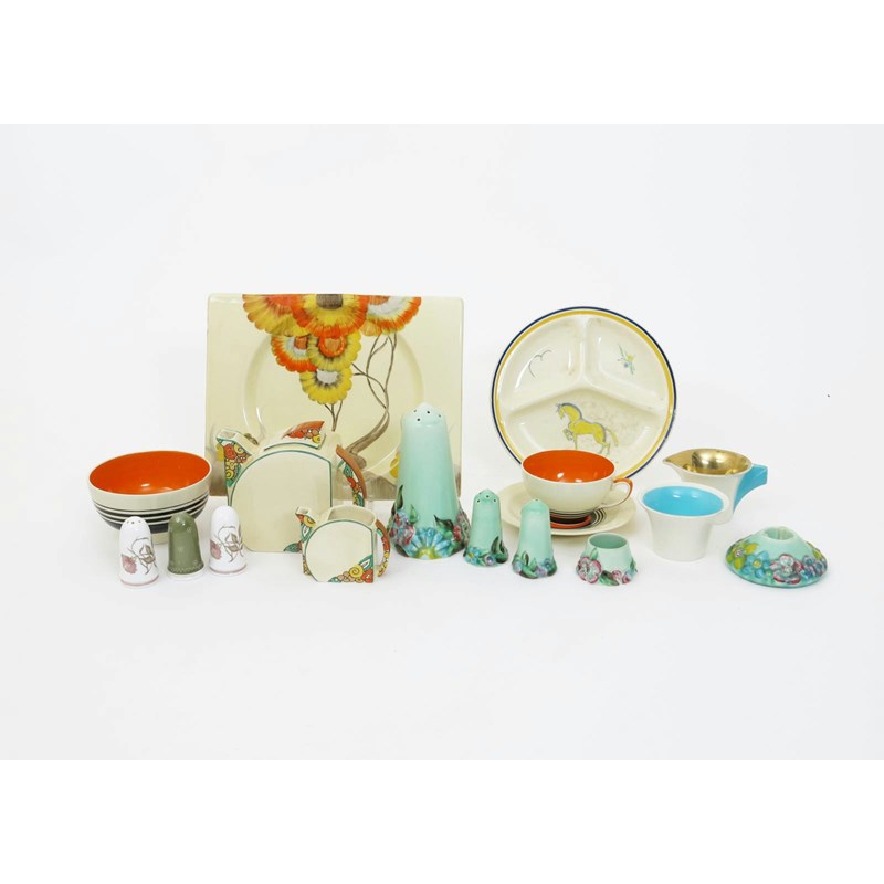 'Rhodanthe' a Clarice Cliff Biarritz plate, painted in colours, a Stamford teapot, cover and milk jug, a My Garden Sugar sifter and cruet and a collection of Clarice Cliff and Susie Cooper ceramics, printed factory marks, 26.5cm. wide