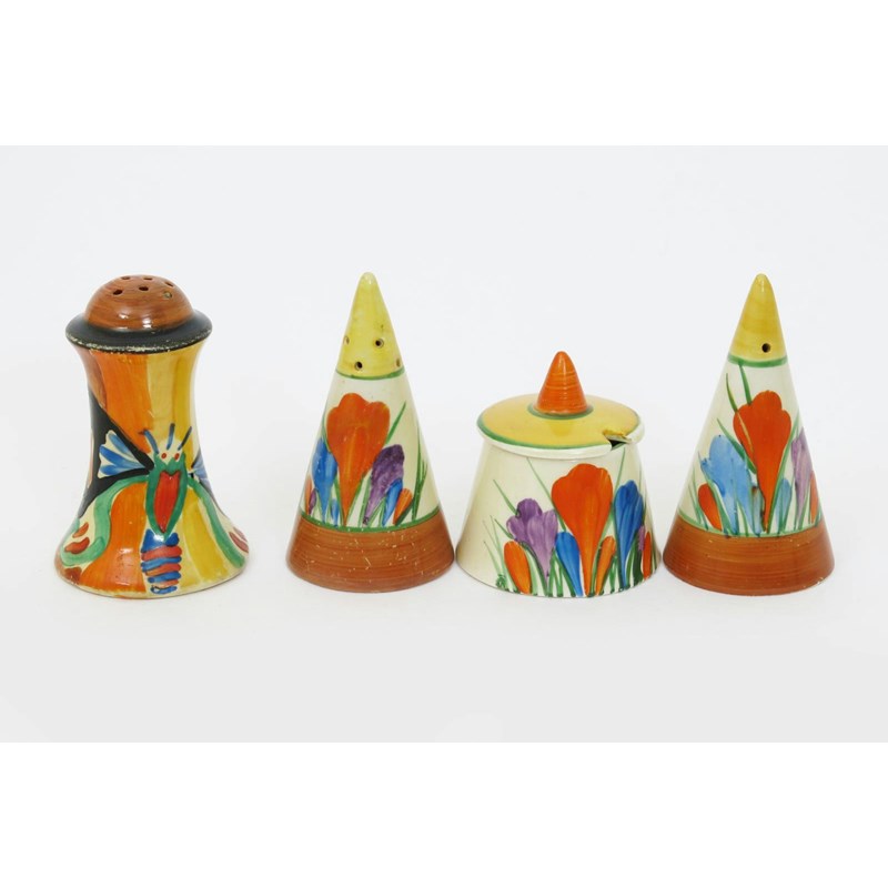 'Butterfly' a Clarice Cliff Fantasque Bizarre pepper pot, painted in colours, and a Clarice Cliff Crocus Conical cruet set printed factory marks,mustard cover restored, 8cm. high